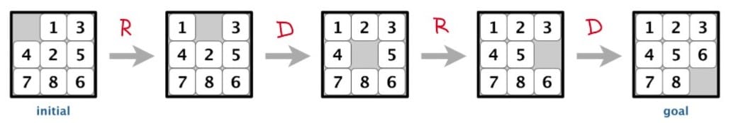 For those not familiar with an 8-puzzle problem, the premise is simple. You are presented with a board that can fit nine tiles, but only eight are present. You must rearrange the tiles until the numbers are sorted, like in the goal image below.