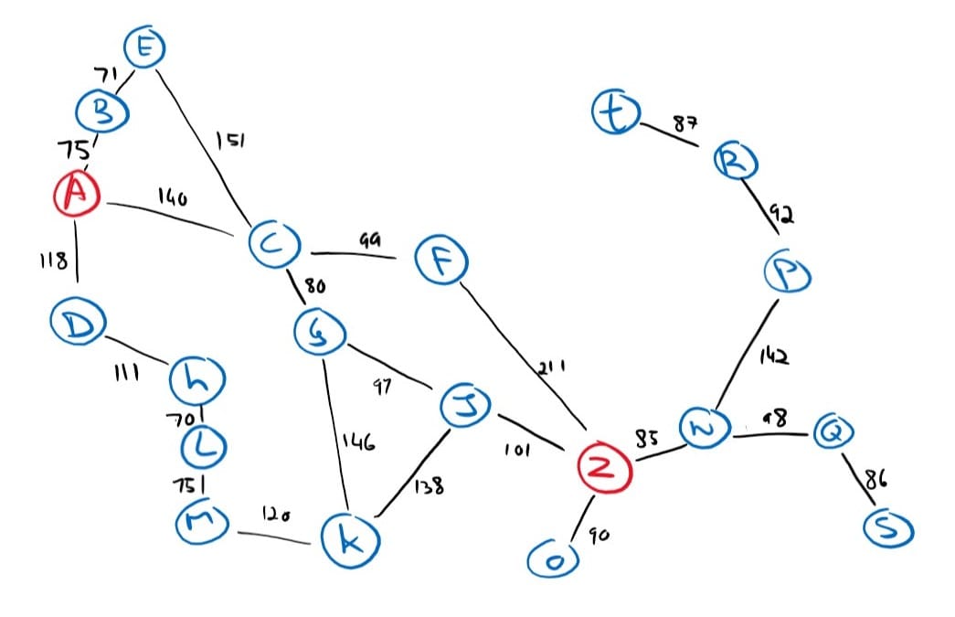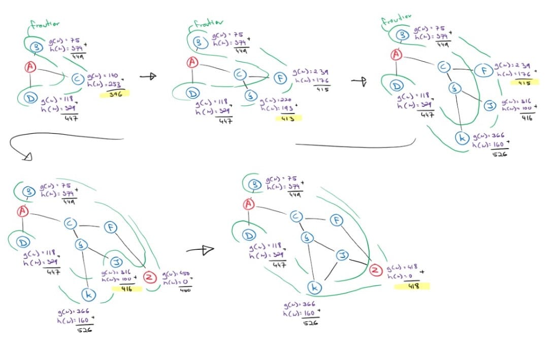 There are a few things to note here. Contrary to the greedy search, A-star’s frontier expands conservatively yet steadily towards the goal. Also, notice that we had to explore more nodes to find a solution because A* search is careful. It also perceived the less optimal solution when it expanded node F (4th graph) with an f(n) value of 450, but another node, J, saw a possible path to the goal with an f(n) value of 416. And so, the algorithm explored node J before returning a solution that it had already found. Sure enough, the path through J found another, better solution. In fact, it’s the cost-optimal solution.