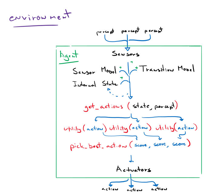 The agent program (alongside the agent architecture) is what we are really interested in. It’s the solution to our problem. In fact, designing agent programs is at the center of modern AI. They typically follow this simple structure: a percept comes in, the program is executed, and an action comes out (‘do nothing’ is a valid action). Note that contrary to the agent function, the agent program will only take one percept at a time to process.